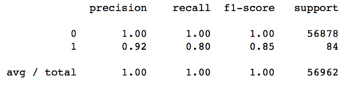 우리 모델은 사기 거래를 예측하기 위해 Random Forests Classifier를 사용합니다. 불균형 데이터 문제를 해결하기 위해 아무것도하지 않고도 우리 모델은 네거티브 클래스 레이블에 대해 100 % 정밀도를 달성 할 수있었습니다.